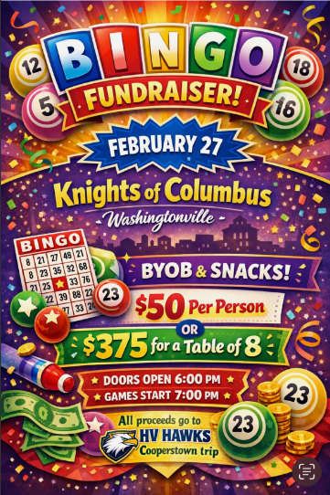 Hudson Valley Hawks FundraiserBINGO!, for the Hudson Valley Hawks Baseball Team as they raise money for their trip to Cooperstown in the Summer!